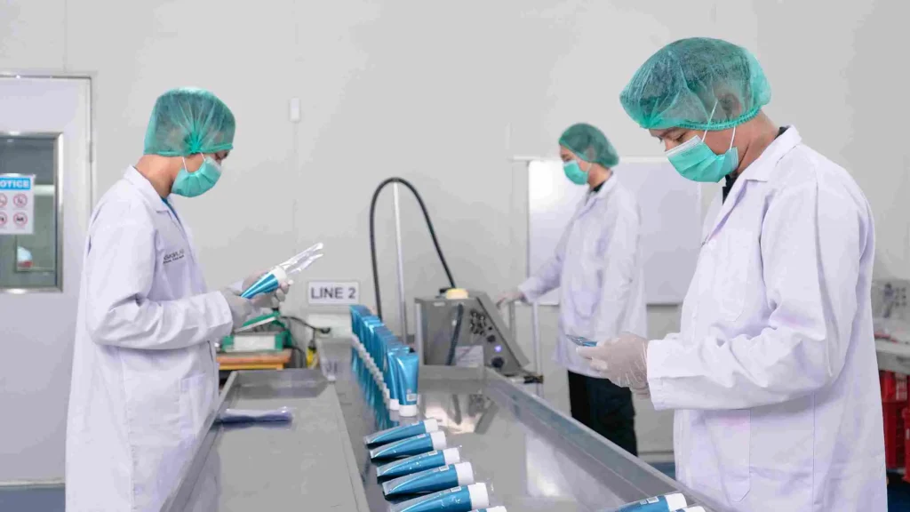 - Formulasi Produk → Meliputi riset tren pasar, pencarian bahan aktif yang relevan, pembuatan formula, hingga uji stabilitas produk.